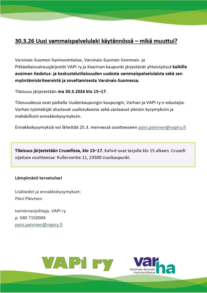 Tervetuloa kaikille avoimeen tiedotus- ja keskustelutilaisuuteen uudesta vammaispalvelulaista. Tilaisuudessa käydään läpi lain muutokset sekä myöntämiskriteerit ja soveltaminen Varsinais-Suomessa.