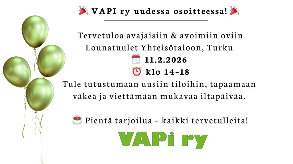 Maanantai 20.10 kello 12-12.45 VAPIn tiedotustilaisuus Toiminnanjohtaja Päivi Päivinen ja hallituksen puheenjohtaja Paula Kukkonen kertovat vuoden 2026 toimintaympäristön muutoksista. Tilaisuuteen voi osallistua Happy Housessa tai etänä Zoomin välityksellä seuraavalla linkillä (salasana 123) https://us02web.zoom.us/j/82768497874