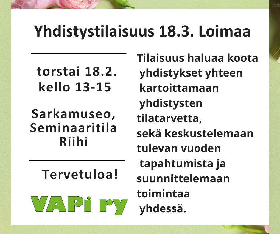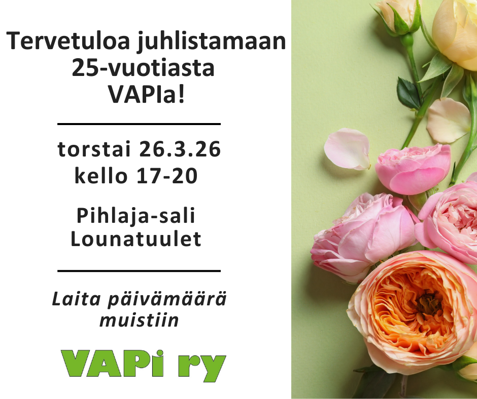 Maanantai 20.10 kello 12-12.45 VAPIn tiedotustilaisuus Toiminnanjohtaja Päivi Päivinen ja hallituksen puheenjohtaja Paula Kukkonen kertovat vuoden 2026 toimintaympäristön muutoksista. Tilaisuuteen voi osallistua Happy Housessa tai etänä Zoomin välityksellä seuraavalla linkillä (salasana 123) https://us02web.zoom.us/j/82768497874